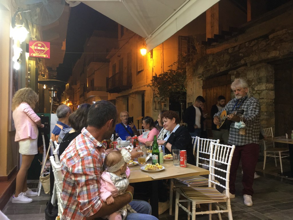 With that information, return to the Greek restaurant with me. As we wait for pizza 2.0, I notice an older man and woman steering a woman in a wheelchair down the bumpy stone street. The woman in the wheelchair is maybe 40, and she has a body that is contorted in unusual angles. She also is missing most of her teeth. But she’s smiling, as are the man and the woman. They sit down at a table one away from us; at the table in between, another, younger couple quietly eats gyros. I think that’s about all that’s going to happen, but then a tall guy comes up to the threesome, greets them happily and loudly, and sits down with them. Then a small, wiry, deeply tanned older man who’s straight out of Central Casting for a Greek fisherman, plops himself down at the end of the table and, all smiles, starts talking rapidly and cheerfully. And then, one by one and two by two, about 20 people gather at the table. Hugs and kisses are exchanged. The woman in the wheelchair gets everyone’s first kiss and hug, and she returns them all enthusiastically. Concerns about Covid aside, this is a genuinely beautiful love fest, especially when somebody shows up with a baby girl to pass around, which starts a new round of kissing and laughing and loud talking. The people around the table don’t look alike; they range from my fisherman to a dyed blond in a white miniskirt to a grandmother who’s about as big around as she is tall to a lanky twenty-something guy with glasses and scruff who is running around with his phone taking pictures and recording video. Wine, beer, and food appear, and before our eyes a festival, a celebration of love and togetherness, unfolds.